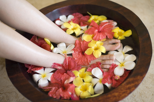 レモングラスやミント、サンダルウッドなどのバスソルトが入った足浴の香りでリラックスしてください。