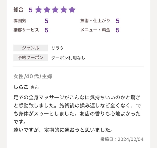 足での全身マッサージがこんなに気持ちいいのかと驚きと感動致しました。施術後の揉み返しなど全くなく、でも身体がスゥーとしました。お店の香りも心地よかったです。