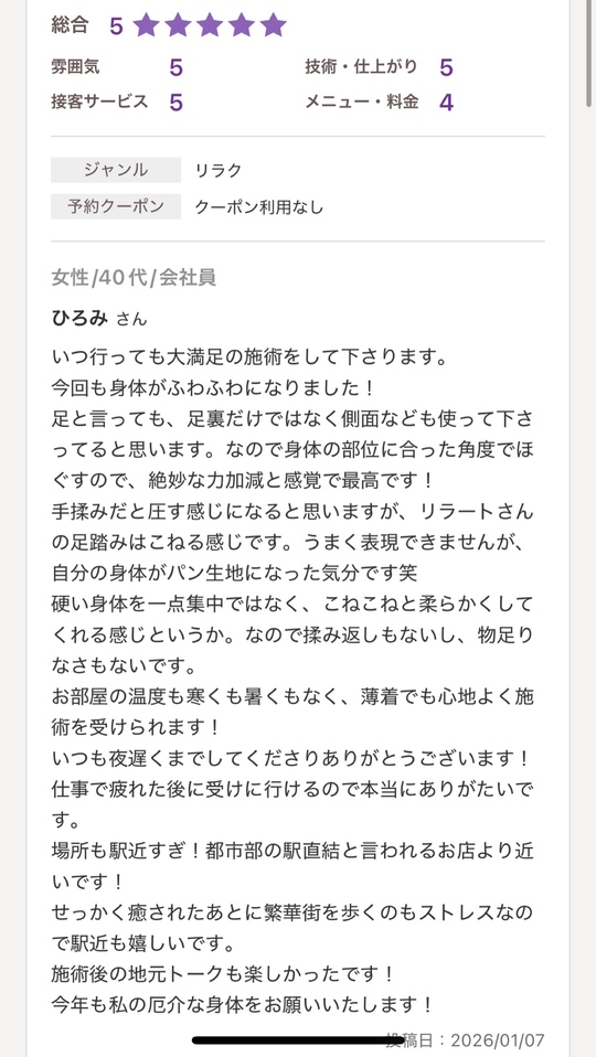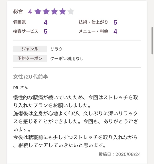 施術後は全身が心地よく伸び、久しぶりに深いリラックスを感じることができました。今回も、ありがとうございます。