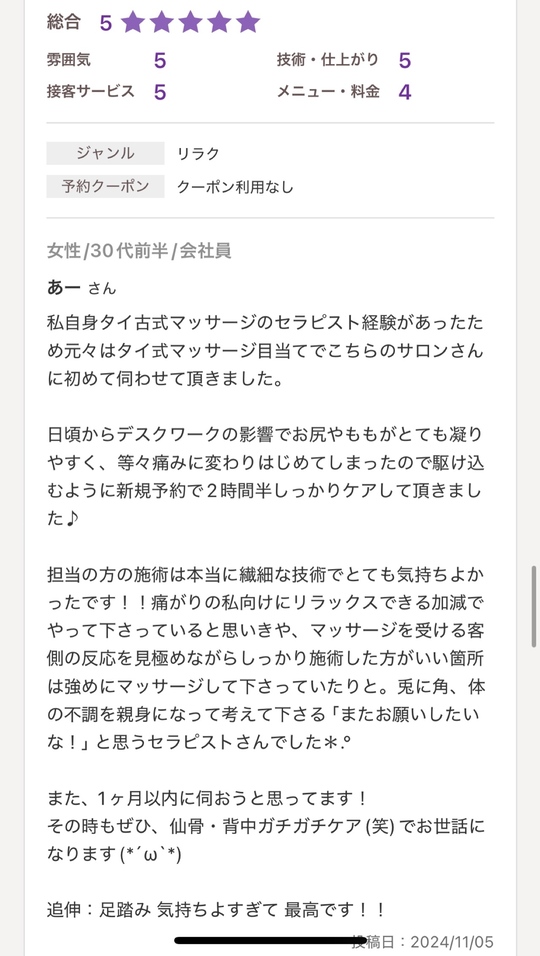 担当の方の施術は本当に繊細な技術でとても気持ちよかったです!!痛がりの私向けにリラックスできる加減でやって下さっていると思いきや、マッサージを受ける客側の反応を見極めながらしっかり施術した方がいい箇所は強めにマッサージして下さっていたりと。兎に角、体の不調を親身になって考えて下さる「またお願いしたいな!」と思うセラピストさんでした*.°