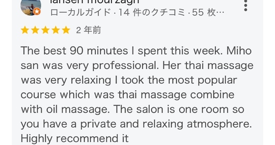 The best 90 minutes I spent this week. Miho san was very professional. Her thai massage was very relaxing I took the most popular course which was thai massage combine with oil massage. The salon is one room so you have a private and relaxing atmosphere. Highly recommend it