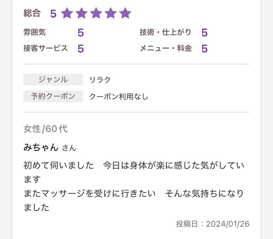 またマッサージを受けに行きたい そんな気持ちになりました。
