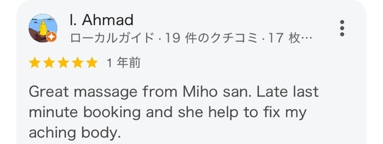 Great massage from Miho san. Late last minute booking and she help to fix my aching body.