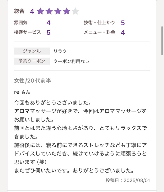 前回とはまた違う心地よさがあり、とてもリラックスできました。